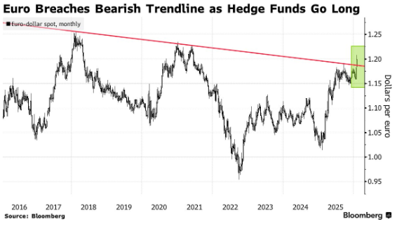 目前有迹象显示涨势或将延续。据熟悉交易情况的外汇交易员透露,宏观投资者和对冲基金本周已增持大量欧元看涨期权头寸。美国存管信托和清算公司的数据显示,过去一周交易的欧元期权中,约有十分之一的目标是押注欧元在6月底前升至1.25美元上方。